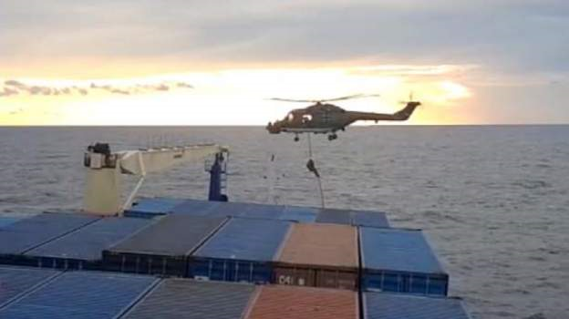 Görüntülerde bir fırkateynin gemiye yanaştığı ve bir helikopterin gemiye asker indirdiği görülüyor.