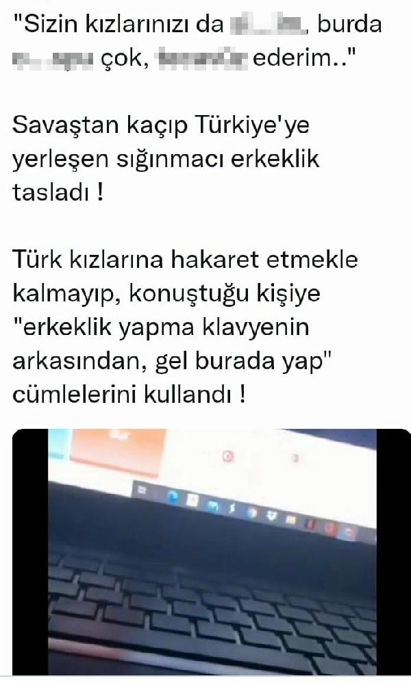 Suriye uyruklu 2 kişi, bir Türk erkeği ile gerçekleştirdiği video görüşmesi sırasında Türk kadınına ağza alınmayacak hakaretlerde bulundu. Görüntülerin sosyal medyada paylaşılmasının ardından Türk kadını hakkında kullanılan ifadeler nedeniyle tepkiler çığ gibi büyüdü. Görüntülerde konuştukları Türk olan kişiye 'Sizin kızlarınız her yerde s....' gibi hakaret ve küfür içerikli söylemlerde bulunan Suriyeli 2 kişi, ayrıca tecavüz edeceklerini de ifade ediyor. Görüştüğü kişinin Türkiye'de yaşadıklarını buna rağmen Türk kadınına hakaret ettiklerini hatırlatmasına rağmen, Suriyeli kişiler yine küfürlü konuşmasını sürdürdü.