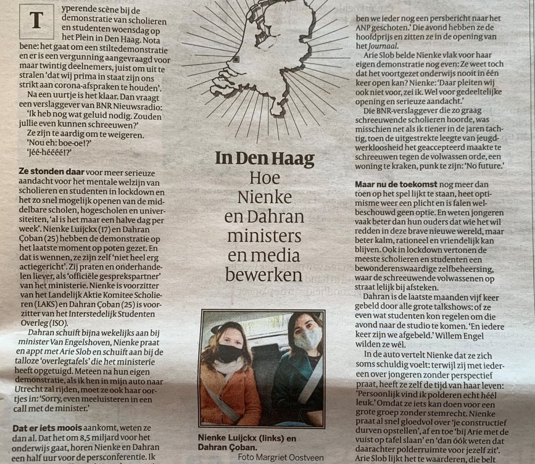 Haberin kahramanları, 25 yaşındaki Dahran Çoban ve 17 yaşındaki Nienke Luijckx, başkanlıklarını yaptıkları öğrenci kuruluşları adına küçük ama nitelikli bir protesto gösterisi organiz etmişlerdi. Bu gösteri sessiz bir gösteri olacak ve sadece 20 kişi katılacaktı.