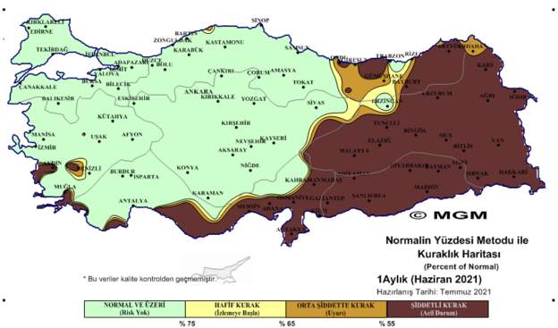 Ülkenin doğusu ve güneyinde Haziran ayında düşen yağışın normal yağışın yüzde 55’inden daha az olduğu görülüyor.