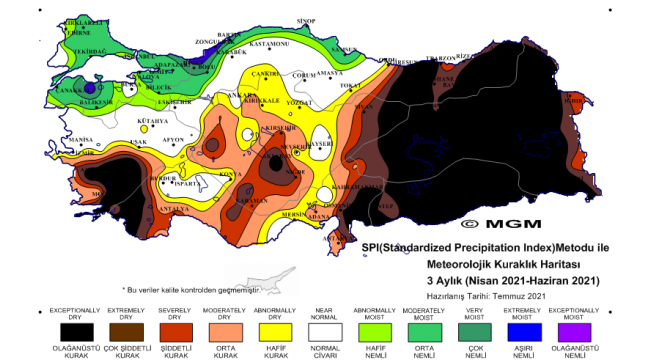 Standart Yağış Modeli’ne göre yapılan ve Nisan-Haziran dönemini kapsayan haritada Türkiye’nin neredeyse yarısı, en büyük kuraklık seviyesi olan olağanüstü kuraklık kategorisinde yer aldı.