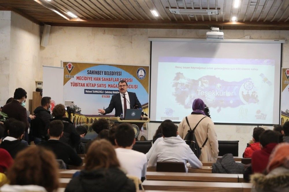 TÜBİTAK Başkanı Prof. Dr. Hasan Mandal, öğrenciler bir araya geldikten sonra Şahinbey Belediyesi tarafından Mecidiye Han Sahaflar Çarşısında TÜBİTAK Kitap Satış Mağazası açılışına katıldı.