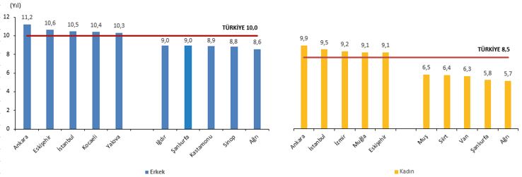 25 yaş ve üzeri nüfusun aldığı ortalama eğitim süresinin 2011-2022 yılları arasında en yüksek artış gösterdiği ilk beş il yüzde 65,1 ile Şırnak, yüzde 53,9 ile Hakkâri, yüzde 51,9 ile Bingöl, yüzde 48,1 ile Muş ve yüzde 46,5 ile Van oldu. En düşük artış gösteren ilk beş il ise yüzde 18,2 ile Ankara, yüzde 20,5 ile Tekirdağ, yüzde 20,8 ile Eskişehir, yüzde 21,5 ile İstanbul ve yüzde 21,6 ile Yalova olarak hesaplandı.