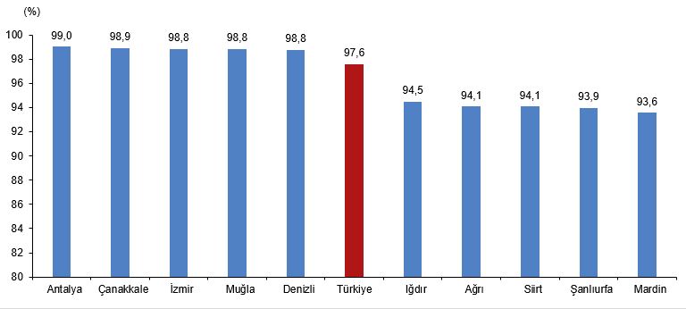 Okuma yazma bilen oranının 2022 yılında en yüksek olduğu il yüzde 99 ile Antalya olurken bu ili sırasıyla Çanakkale, İzmir, Muğla ve Denizli takip etti. Bu oranın en düşük olduğu il ise yüzde 93,6 ile Mardin olurken bu ili sırasıyla Şanlıurfa, Siirt, Ağrı ve Iğdır izledi.