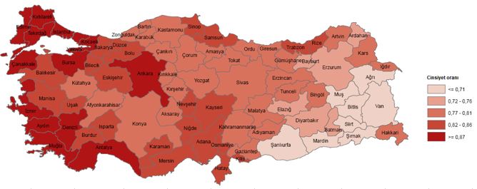 Kadınlarda okuma yazma bilen oranının en yüksek olduğu iller yüzde98,4 ile Antalya ve Çanakkale olurken bu illeri sırasıyla İzmir, Denizli ve Muğla takip etti. Bu oranın en düşük olduğu il ise yüzde 89 ile Mardin olurken bu ili sırasıyla Şanlıurfa, Ağrı, Siirt ve Iğdır izledi. Erkeklerde ise okuma yazma bilen oranı Türkiye genelinde iller arasında belirgin bir fark göstermedi.