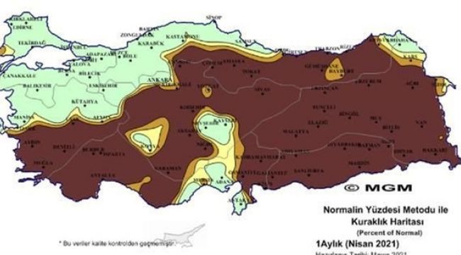 Nisan ayı kuraklık ve sıcaklık raporlarındaki haritaya göre Türkiye'de Doğu Anadolu, Güneydoğu ve Ege'nin güney kesimlerinde 'şiddetli', 'çok şiddetli' ve 'olağanüstü' kuraklık görüldü.