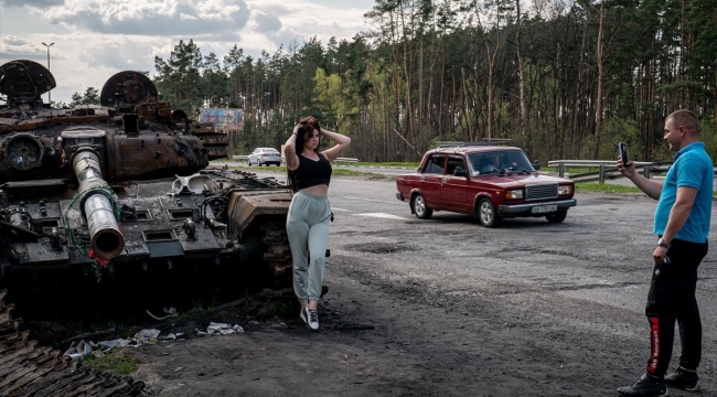 Rusların çekildiği Kiev ve çevresinde hayat normale dönmeye başlarken, bölgeye dönen Ukraynalıların imha edilen Rus savaş araçları önünde fotoğraf çektirdikleri görüldü.
