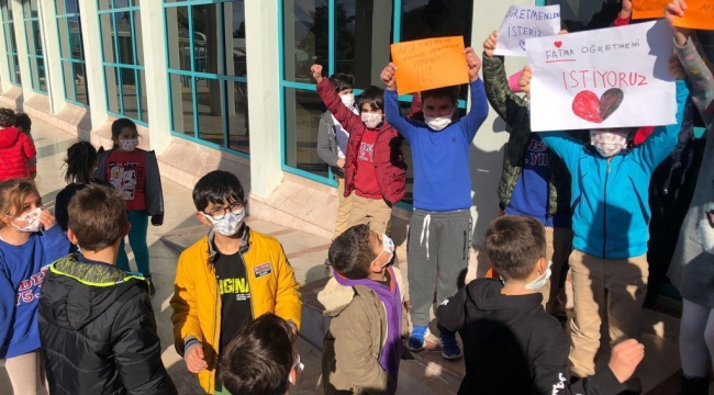 Minik öğrenciler öğretmenleri için okulda pankart açarken velilerin de verdikleri dilekçenin dikkate alınmaması durumunda eyleme gideceği belirtildi.