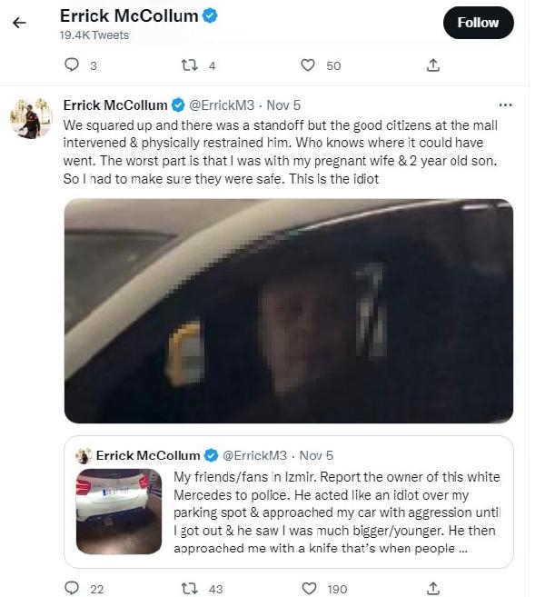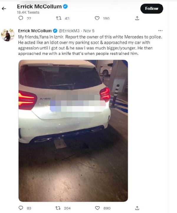 Türkiye Sigorta Basketbol Süper Ligi'nde Pınar Karşıyaka forması giyen ABD'li oyun kurucu Errick McCollum, İzmir'de, 5 Kasım'da ailesiyle birlikte Karşıyaka ilçesinde gittiği AVM'nin otoparkında yaşanan park yeri tartışmasında karşı araçtan inen sürücünün kendisine bıçak çektiğini iddia etti. Sosyal medya hesabından açıklama yapan ve otomobil fotoğrafı paylaşan ABD'li basketbolcu, "Bu kişiyi polise bildirin. Benim ondan çok daha büyük ve genç olduğumu görünce bana bıçakla saldırdı. Hamile eşim ve 2 yaşındaki oğlum da yanımdaydı, onları korumak istedim. Benim hakkım olan park yerinde bir aptal gibi davrandı ve ben arabadan inene kadar öfkeyle hareket etti. Benim ondan daha genç ve daha iri olduğumu fark ettikten sonra duraksadı ve bıçağını çıkararak bana yaklaşmaya çalıştı. O andan sonra etraftaki insanlar olaya müdahale ederek kendisine engel oldular. Olaylar büyüyecek gibiyken etraftaki iyi niyetli insanlar duruma engel oldular ve saldırgana fiziksel müdahalede bulundular. Eğer müdahale etmeselerdi kim bilir işler hangi boyuta varacaktı? İşin en kötü kısmı ise yanımda hamile eşim ve 2 yaşındaki oğlumun olmasıydı. Bu sebeple karşımdaki şahısla uğraşırken aynı zamanda onların güvenliğinden emin olmak durumundaydım" dedi.