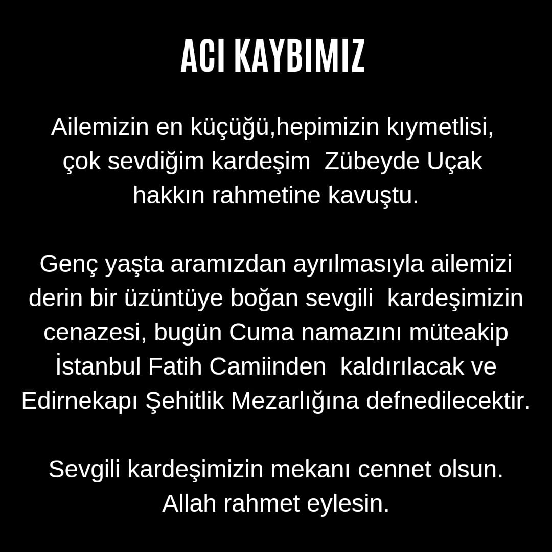 Uzun süredir amansız hastalıkla mücadele eden Zübeyde Uçak, evli ve üç çocuk annesiydi. Kardeşi Zübeyde Uçak’ın vefatını sosyal medya hesabından duyuran Başkan Uçak, “Ailemizin en küçüğü, hepimizin kıymetlisi, çok sevdiğim kardeşim Zübeyde Uçak hakkın rahmetine kavuştu” dedi.