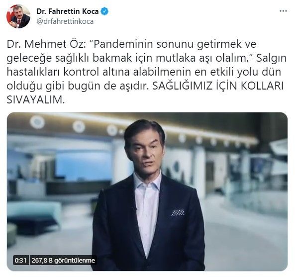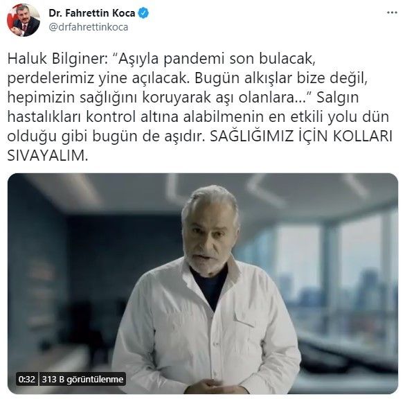 Videoda yer alan diğer ünlü isimlerden Dr. Mehmet Öz, "Pandeminin sonunu getirmek ve geleceğe sağlıklı bakmak için mutlaka aşı olalım" derken, Haluk Bilginer ise, "Aşıyla pandemi son bulacak, perdelerimiz yine açılacak. Bugün alkışlar bize değil, hepimizin sağlığını koruyarak aşı olanlara" dedi.