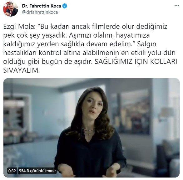 Ezgi Mola, "Bu kadarı ancak filmlerde olur dediğimiz pek çok şey yaşadık. Aşımızı olalım, hayatımıza kaldığımız yerden sağlıkla devam edelim" ifadelerini kullanırken, Şener Şen de, "Sinemalarda, konserlerde, tiyatrolarda yeniden buluşmamız için ve normal hayatımıza geri dönmemiz için siz de mutlaka aşınızı yaptırın" dedi.