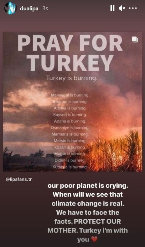 Ünlü şarkıcı, sosyal medya hesabında bir paylaşımda bulunarak Türkiye'ye destek oldu. Lipa, Türkiye'nin yanında olduğunu belirttiği paylaşımda şu ifadelere yer verdi: "Zavallı gezegenimiz ağlıyor. İklim değişikliğinin gerçek olduğunu ne zaman göreceğiz? Gerçeklerle yüzleşmeliyiz. Doğa anayı koruyun. Seninleyim Türkiye"