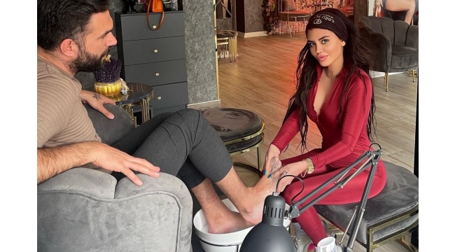 Güzellik merkezinde sevgilisi Tolgahan Yıldız'ı ağırlayan Ebru Polat, kafasına bir bandana takarak kolları sıvadı. Sevgilisinin ayaklarını leğene sokan Polat, ayakları yıkarken fotoğraf çekildi.