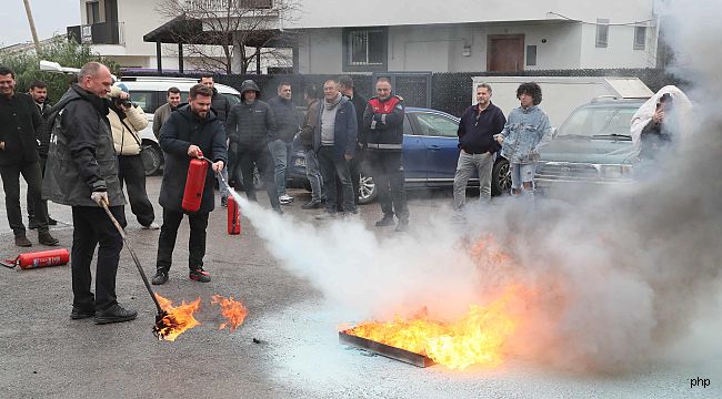 Eğitimde, yangın durumunda ilk yapılması gerekenin müdahale değil, yangını çevreye duyurmak olduğuna dikkat çekildi. Haktanır, “Yangın çıktığında öncelikle ortamda bulunan insanlara duyurulmalı. Alarm butonu varsa basılmalı, yoksa bağırarak yangının yeri belirtilmeli. Ardından 112 aranarak açık adres ve yangının kimliği bildirilmelidir. Yangının boyutuna göre eğitimli ve bilinçli bir şekilde müdahale edilebilir. Ancak eğer yangın kontrolden çıkmışsa müdahale etmeye çalışmayın, can güvenliğiniz her şeyden önemli” dedi. Haktanır, yangın çıkış nedenleri arasında tedbirsizlik, bilgisizlik, ihmal ve dikkatsizliğin büyük rol oynadığını belirtti. Sigara izmaritlerinin gelişigüzel atılmasının hâlâ yangınlara sebep olduğunu vurgulayan Haktanır, sabotaj, trafik kazaları ve doğa olaylarının da yangına yol açabileceğini dile getirdi. Son olarak, Maraş depreminin ardından İskenderun Limanı'nda konteyner yangını çıktığını ve söndürme çalışmalarının üç gün sürdüğünü hatırlattı. Eğitimin sonunda işletmeciler, Urla İtfaiye Grubu’nda yangın tüpü kullanımı ve yangına yaklaşma konularında uygulamalı tatbikat gerçekleştirdi.