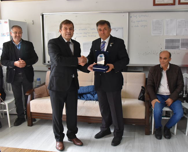 Çoban' a okul müdürü yaptıkları katkılardan dolayı plaket taktim etti.