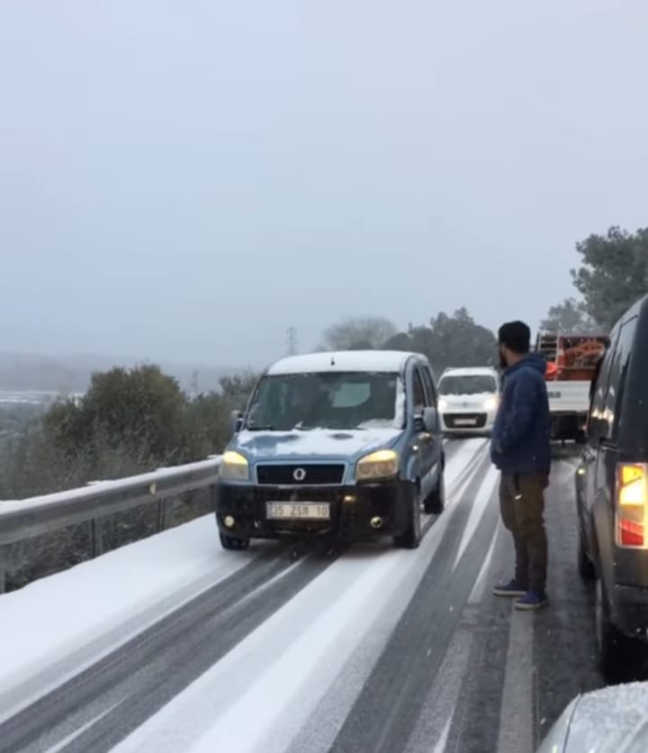 İzmir Urla'da Barbaros, Uzunkuyu, Zeytinler, Zeytineli ve Nohutalan Mahallesinde etkili olan kar yağışı nedeniyle, Tepe Kahve Çetin'in Yeri'nin bulunduğu bölgede ve otobanda araçlar yolda kaldı.