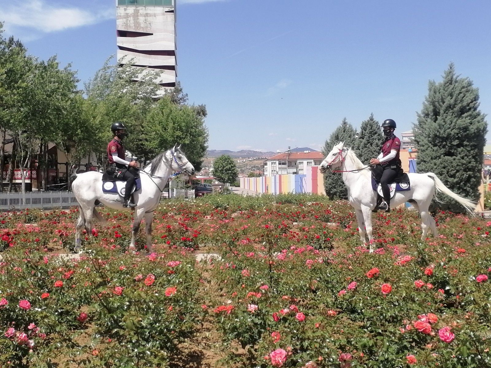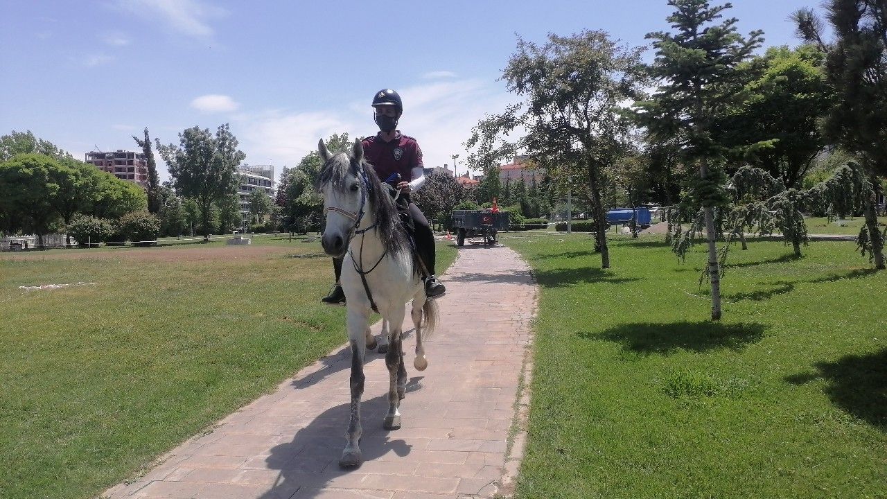 Uşak'ta korona virüs tedbirleri kapsamında düzenlenen denetlemeler devam ederken, atlı polisler de denetlemelere katıldı.