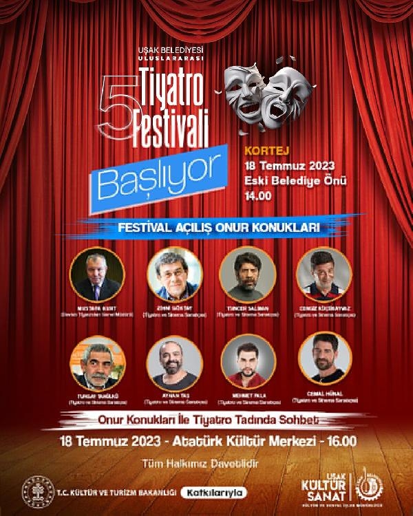 Uşak Belediyesi 5. Uluslararası Tiyatro Festivali, 18 Temmuz saat 14.00'te eski belediye binası önünden başlatılacak kortej yürüyüşüyle başlayacak. Festivaline başta Devlet Tiyatroları Genel Müdürü Mustafa Kurt olmak üzere, birbirinden ünlü tiyatro ve sinema sanatçısı katılacak. Aynı gün saat 16.00'da Atatürk Kültür Merkezi'nde gerçekleştirilecek olan 'Tiyatro Tadında Söyleşi' programında, değerli isimler Zihni Göktay, Tuncer Salman, Cengiz Küçükayvaz, Turgay Tanülkü, Ayhan Taş, Mehmet Pala ve Cemal Hünal Uşak halkı ile bir araya gelecek.