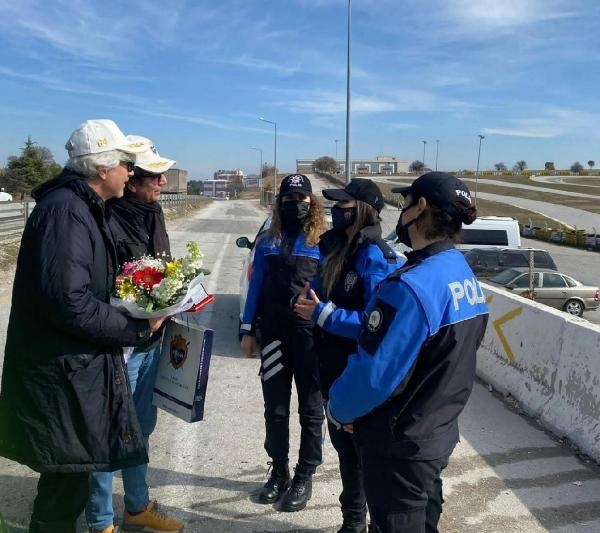 UŞAK İl Emniyet Müdürlüğü ekipleri, 'Süt Kardeşler' adlı tiyatro oyununu sahnelemek için kente gelen Süheyl ve Behzat Uygur kardeşleri uygulama noktasında durdurdu. Polisler, denetim için durdurulduklarını sanan Uygur kardeşlere, çiçek ve plaket verdi.