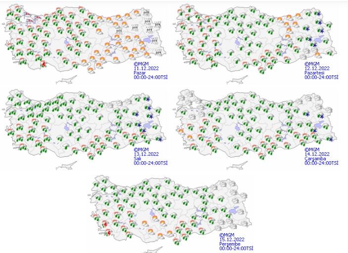Yapılan en son değerlendirmelere göre: Ülkemiz genelinin parçalı ve çok bulutlu, Marmara, Ege, Akdeniz, İç Anadolu (Sivas hariç), Batı ve Orta Karadeniz (Ordu hariç) ile Malatya, Adıyaman, Gaziantep ve Kilis çevrelerinin yağmur ve sağanak, yer yer gök gürültülü sağanak yağışlı geçeceği tahmin ediliyor.