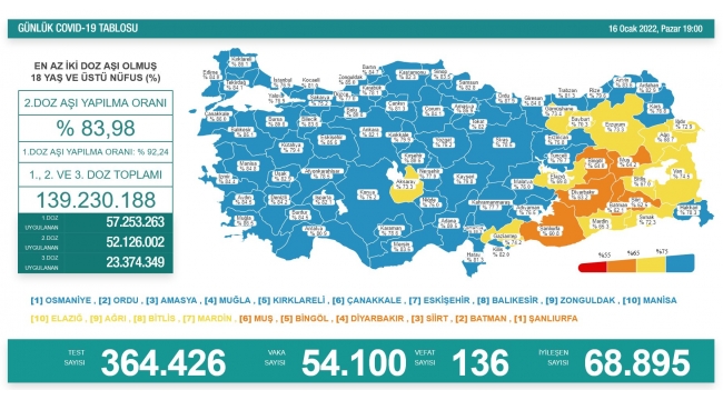 Sağlık Bakanlığı tarafından 16 Ocak koronavirüs tablosu, vaka, hasta, test, vefat sayısı ve son durum açıklandı. Türkiye'de son 24 saatte 364 bin 426 Kovid-19 testi yapıldı, 54 bin 100 kişinin testi pozitif çıktı, 136 kişi yaşamını yitirdi.