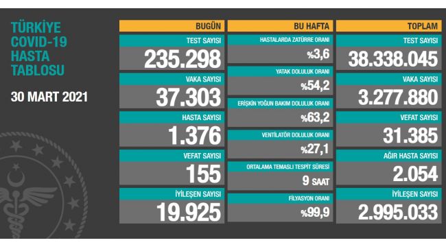 Sağlık Bakanlığının Covid-19 bilgilendirme sayfasında Türkiye'nin güncel korona virüs tablosu kamuoyuyla paylaşıldı. Tabloya göre son 24 saatte 155 kişi korona virüsten hayatını kaybetti, toplam can kaybı 31 bin 385'a yükseldi. Toplamda 38 milyon 338 bin 45 test yapıldı. Bugün yapılan 235 bin 298 testten, 37 bin 303 yeni vaka sayısı, bin 337 kişi de yeni hasta sayısı olduğu belirtildi. Toplam vaka sayısının 3 milyon 277 bin 880 olduğu, bugün iyileşen 19 bin 925 kişiyle birlikte toplam iyileşen hasta sayısının 2 milyon 995 bin 33'a yükseldiği, toplam hastalarda zatürre oranının yüzde 3,6, ağır hasta sayısının ise 2 bin 54 olduğu açıklandı.