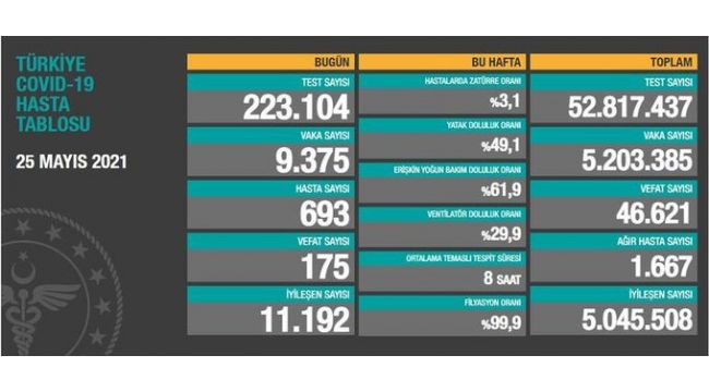 Sağlık Bakanlığının Covid-19 bilgilendirme sayfasında Türkiye'nin güncel korona virüs tablosu kamuoyuyla paylaşıldı. Tabloya göre son 24 saatte 175 kişi korona virüsten hayatını kaybetti, toplam can kaybı 46 bin 621'a yükseldi. Toplamda 52 milyon 817 bin 437 test yapıldı. Bugün yapılan 223 bin 104 testten 9 bin 375 yeni vaka sayısı, 693 kişi de yeni hasta sayısı olduğu belirtildi. Toplam vaka sayısının 5 milyon 203 bin 385 olduğu, bugün iyileşen 11 bin 192 kişiyle birlikte toplam iyileşen hasta sayısının 5 milyon 45 bin 508'e yükseldiği, toplam hastalarda zatürre oranının yüzde 3,1, ağır hasta sayısının ise bin 667 olduğu açıklandı.