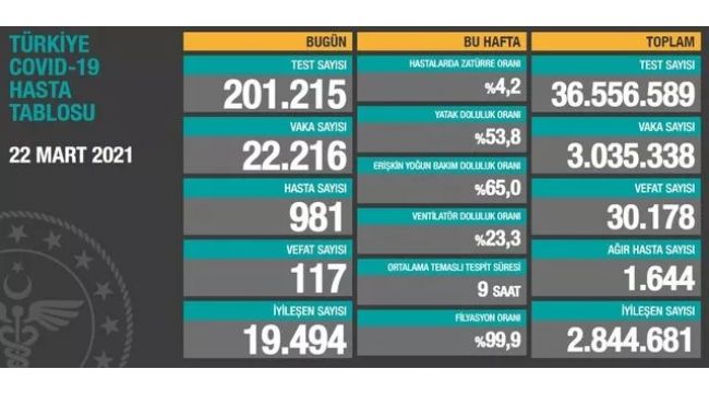 Türkiye'de koronavirüs nedeniyle son 24 saatte 117 kişi hayatını kaybetti, yeni vaka sayısı ise 22 bin 216 oldu. İşte 22 Mart koronavirüs tablosunda son durum...