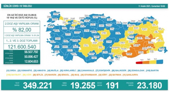 Sağlık Bakanlığı tarafından Türkiye'nin yeni korona virüs tablosu açıklandı. 11 Aralık’ta açıklanan 24 saatlik verilere göre 19 bin 255 vaka tespit edildi. Virüs nedeniyle hayatını kaybedenlerin sayısı 191 oldu. Bir günde toplam 349 bin 221 test yapılırken, iyileşen hasta sayısı 23 bin 180 olarak kaydedildi.
