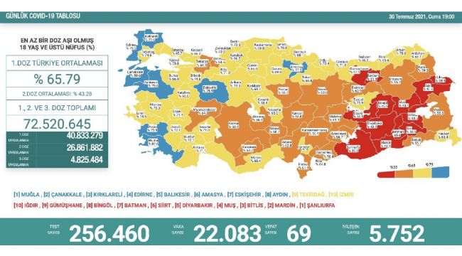 Sağlık Bakanlığı tarafından Türkiye'nin yeni korona virüs tablosu açıklandı. 30 Temmuz'da açıklanan 24 saatlik verilere göre 22 bin 83 vaka tespit edildi. Virüs nedeniyle hayatını kaybedenlerin sayısı 69 oldu. Son 1 günde toplam 256 bin 460 test yapılırken, iyileşen hasta sayısı 5 bin 752 olarak kaydedildi. Sağlık Bakanlığı tarafından açıklanan tabloda, aşılama verilerine de yer verildi. En az 1 doz aşı olmuş 18 yaş üzeri nüfusu kapsayan verilere göre Türkiye'de 1. doz aşılama ortalama yüzde 65,79 oldu. 2. doz ortalaması yüzde 43,28 olurken, 1., 2. ve 3. doz aşısını olan vatandaş sayısı toplamda 72 milyon 520 bin 645'e yükseldi.