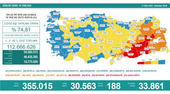 Verilerde aşılamada önde giden illere de yer verildi. Bakanlığın tablosuna göre yüzde 80,3 ile Türkiye'de en çok aşılamanın gerçekleştirildiği Kırklareli'yi Muğla, Ordu, Çanakkale, Amasya, Eskişehir, Edirne, Osmaniye, Balıkesir ve Burdur takip etti.