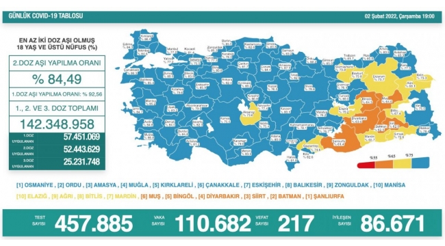 Koca'nın paylaştığı tabloya göre, Türkiye'de son 24 saatte 457 bin 885 korona testi yapıldı, 110 bin 682 kişinin testi pozitif çıktı, 217 kişi hayatını kaybetti.