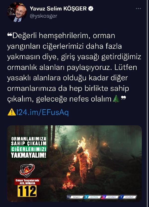 İzmir Valisi Yavuz Selim Köşger, sosyal medya hesabından yaptığı açıklamayla orman yangınlarının önüne geçilmesi için giriş yasağı getirilen ormanları liste halinde duyurdu. Açıklamada, "Değerli hemşehrilerim, ciğerlerimizi daha fazla yakmasın diye, giriş yasağı getirdiğimiz ormanları paylaşıyoruz. Lütfen yasaklı alanlara olduğu kadar diğer ormanlarımıza da hep birlikte sahip çıkalım, geleceğe nefes olalım" ifadelerine yer verildi. Vali Köşger'in açıkladığı listede, Çiçekli, Atatürk, Karacadağ, Kavaklıdere, Dikmendağı, Çatalkaya, Başpınar, Uzunkuyu, Parsa, Fındıklıdere ile Çağlan civarı ve ağaçlandırma sahası, Kırkgeçit- Çatalçam, Karadere, Yamanlar-Karagöl, Meryemana, Mehmetler, Korucuk, Nif dağı, Kartal, Doğanbey, Armutlu- Bayramlı yol güzergahı, Kurudere köyü hudutlarındaki tüm ormanlar, Kestane Deresi, Aliağa ilçesi Merkez Ormanları, Pınarcık, Buca-Sarnıç ve Oğlananası ormanları yer aldı.