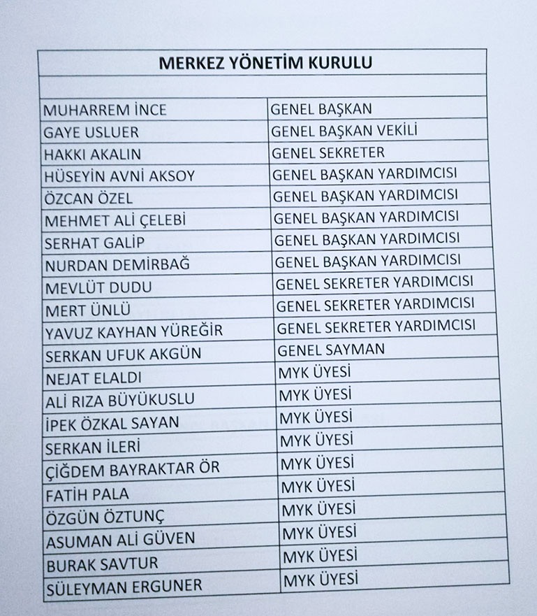 “Memleket Partisi’nin ülkemiz için hayırlı ve uğurlu olmasını diliyoruz. “Geleceğimizi geri alacağız” diyoruz, Memleket Partisi olarak geleceğimizi barışla, özgürlükle ve yeniden demokrasiyle taçlandırmak üzere söz veriyoruz. Biraz önce genel merkezimizde parti meclisi toplantı salonumuzda İçişleri Bakanlığı’ndan aldığımız belgeyi kurucular kuruluyla paylaştık. Genel başkanımızı seçtik, Muharrem İnce oy birliği ile seçildi.”