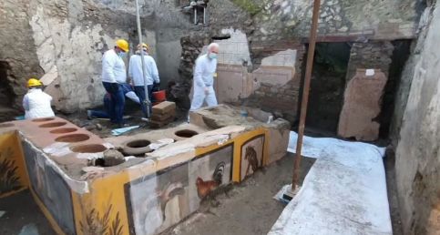 İtalya'daki Pompeii kentinde, arkeologlar eski sokak yemeği kültürünü gösteren freskli bir sıcak yiyecek ve içecek dükkanının tamamını gün yüzüne çıkardı.