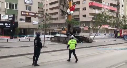 6.6'lık deprem sonrasında hasar gördüğü için kontrollü yıkımına karar verilen bir binada yürütülen çalışmalar sırasında, binada bulunan Türk bayrağı bulunduğu yerden indirilerek İzmir Emniyet Müdürlüğü'nün görevli polisleri tarafından teslim alındı.