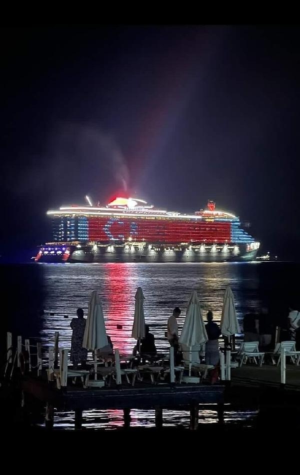 Bodrum ilçesine sabah saatlerinde demirleyen ve akşam saatlerinde tekrar denize açılan Bahamalar bandıralı 277 metre uzunluğundaki 2 bin 63 yolcu ve 1131 personeli bulunan 'Resilient Lady' isimli gemiden, Cumhuriyet'in 100'üncü yılı dolayısıyla Türk bayrağı ışıklandırması yansıtıldı.