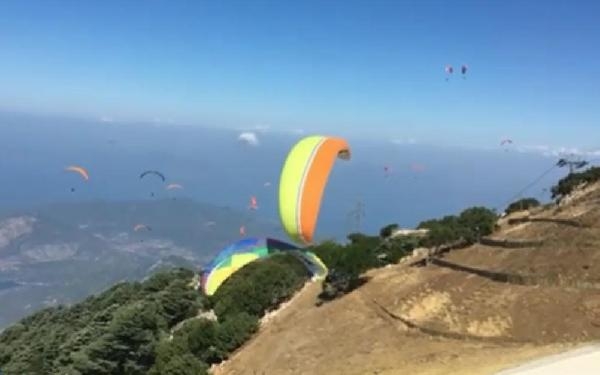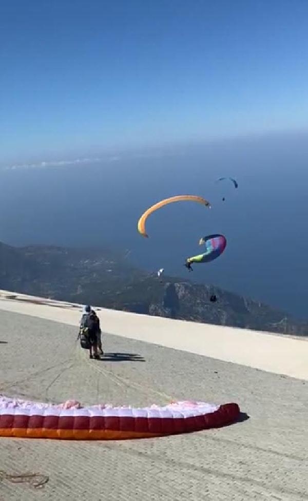 MUĞLA'nın Fethiye ilçesindeki Babadağ'dan tandem atlayış yapan yamaç paraşütü pilotları, kalkış sırasında birbirine dolandı. Havada çarpışıp, yaralanan 2 pilot ve 1'i Çinli 2 yolcu, hastaneye kaldırıldı. Çarpışma anı, cep telefonu kamerasına yansıdı.