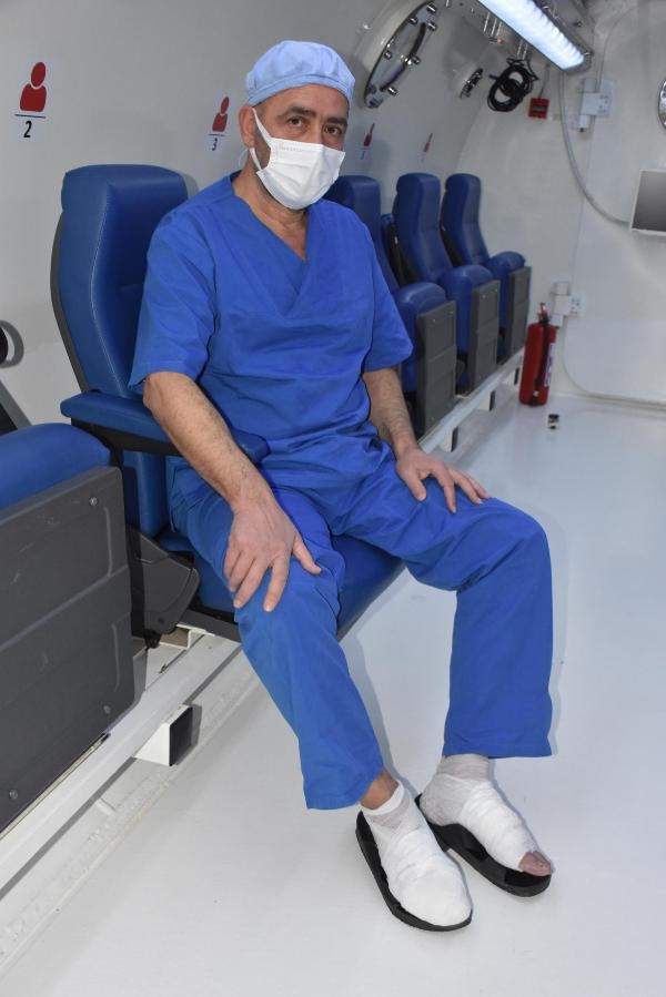 "Hiperbarik oksijen tedavisi, ilaç kullanmadan saf oksijen solumayla uygulanan bir tedavi yöntemidir. Ama beraberinde hastanın durumuna göre, antibiyotik tedavisi ya da yara bakımı da gerekebiliyor. Basınca bağlı hastaların kulaklarını eşitlemede zorlandığını biliyoruz. Kulak barotravmalarının dışında ağır bir kalp yetmezliği ve akciğer hasarı yoksa hastaların hepsi bu tedaviden faydalanabilir. Hastalar maske takarak, kapalı devrede oksijen soluyor. Tedavi gören hastalarımız arasında yıllarca süren arkadaşlıklar da başlayabiliyor."