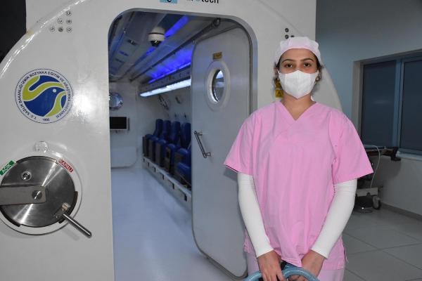 2017 yılında hizmet vermeye başlayan Hiperbarik Oksijen Tedavi Merkezi'nin idari sorumlusu Uzman Dr. Figen Aydın, 12 kişilik kabinde, hastaların normal atmosfer basıncının yaklaşık 2,5 katında yüksek basınç altında, aynı anda saf oksijen solumalarının sağlandığını söyledi. Hastaların her gün 2 saat süren tedavi için kabine girdiklerini anlatan Aydın, "Hastalarımızın bazıları hastanede yatarak da tedavi oluyor. Karbonmonoksit intoksikasyonu, soba zehirlenmeleri ve vurgun hastalıkları gibi acil durumlar ile diyabetik ayak yaraları gibi iyileşmeyen yaralar, radyasyon hasarları, kemik iltihapları, ani gelişen görme ve işitme kayıpları en sık karşılaştığımız hastalıklar arasında yer alıyor" dedi.