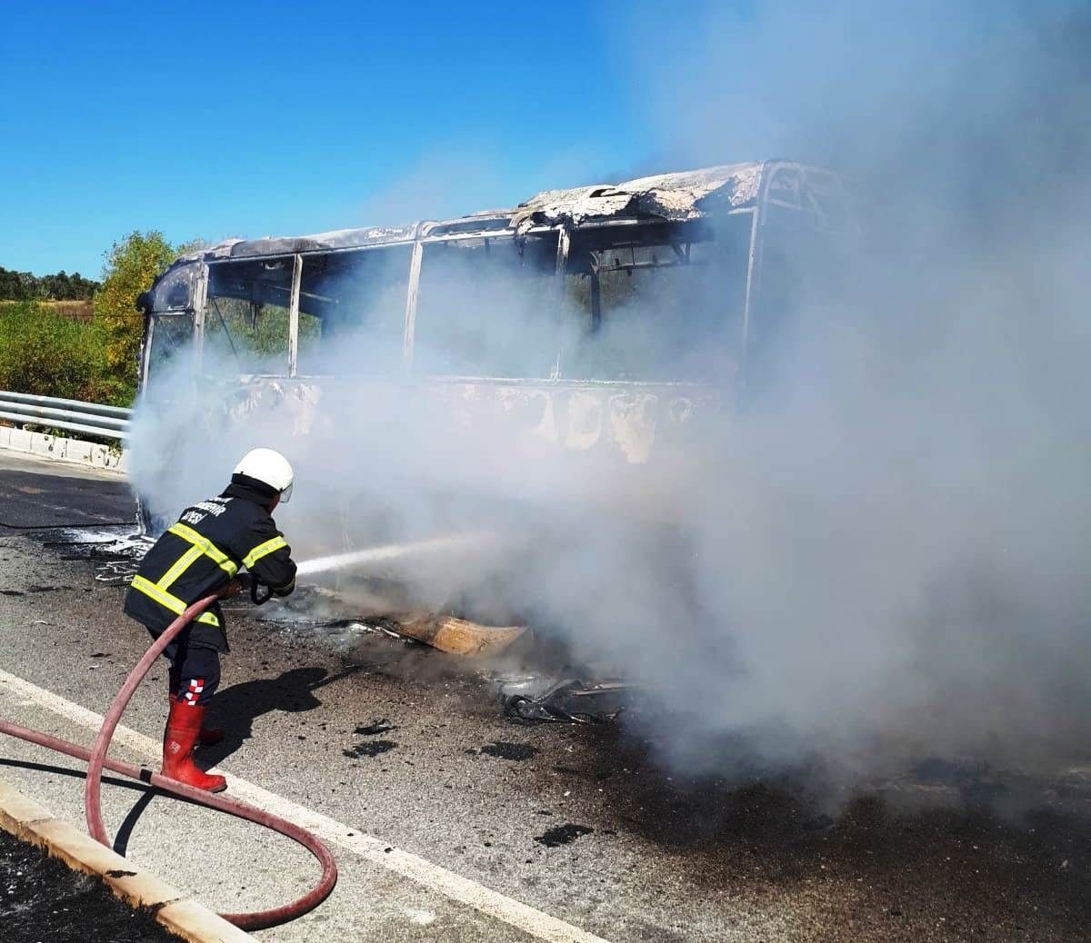 Aydın'ın Söke ilçesinde seyir halinde olan özel bir tur firmasına ait otobüs yanarak küle döndü.