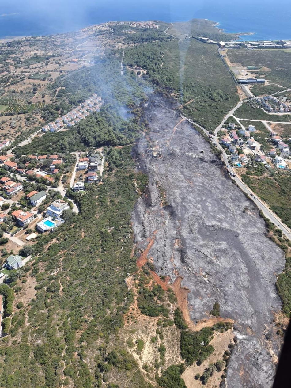 Seferihisar’da çıkan orman yangını yerleşim yerlerinin sınırında söndürüldü. Yanan alanın havadan fotoğrafları akıllara soru işareti getirdi.