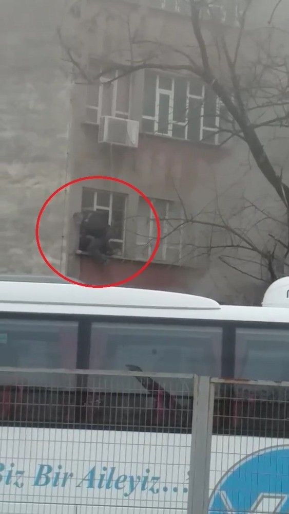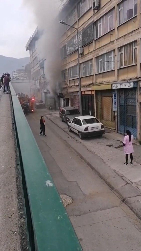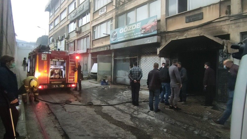 Bursa'da iş hanında çıkan yangında bir dükkan kullanılamaz hale geldi. Mahsur kalan bir esnaf, camdan çıkarak yangından kurtulmaya çalıştı.