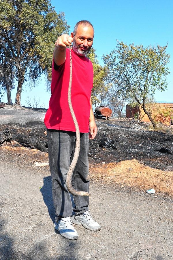 Mahalle sakinlerinden Hakkı Öztürk (46) de ormanda yangından etkilenmiş olarak bulduğu yılanı kurtardı. Kuyruğundan tuttuğu yılanı güvenli bölgeye getiren Öztürk, doğaya saldı.