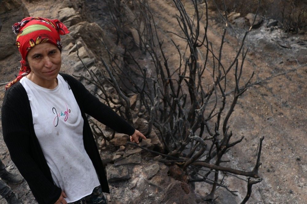 Yangında evi, hayvanları ve seraları zarar gören Sevim Ülker de yangın çıktığında hemen kendilerine bilgi geldiğini dile getirdi. Yangını duyar duymaz yaşlı annesi ile ablasını kaçırdıklarını vurgulayan Ülker, "Geri buraya geldiğimizde her taraf yanmış, bitmişti. Annem ve ablam yaşlıydı. Önce onları kurtardık. Tabi burada tavuklarımız, koyunlarımız, keçilerimiz, muzumuz, zeytinlerimiz vardı. Her şeyimiz yanmış. 35 tavuğumuzun tamamı yanmış. İlk yangını duyduğumuzda tabi ailemizi kurtarmayı düşündük. O an hep ağlıyorduk, bir şey yapamıyorduk, elimizden bir şey gelmiyordu. Hatta hayvanların bulunduğu yerin kapılarını açtık ki kaçıp, canlarını kurtarsınlar diye ama tavukların hepsi ölmüş. Koyunlarımız saklanınca, yanmaktan kurtulmuşlar. Devletin yardım elini uzatmasını bekliyoruz" şeklinde konuştu.