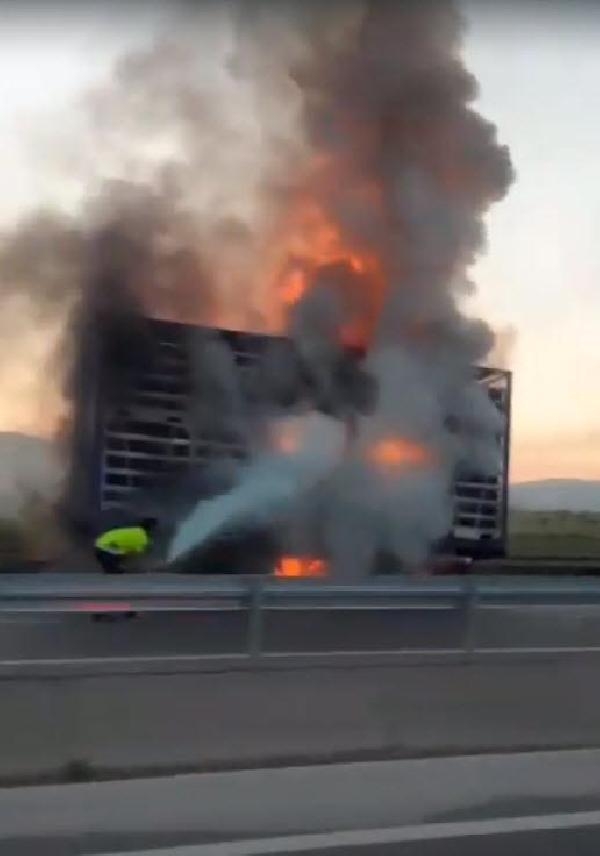 MANİSA'nın Alaşehir ilçesinde seyir sırasında alev alan kamyondaki 1500 tavuk öldü.