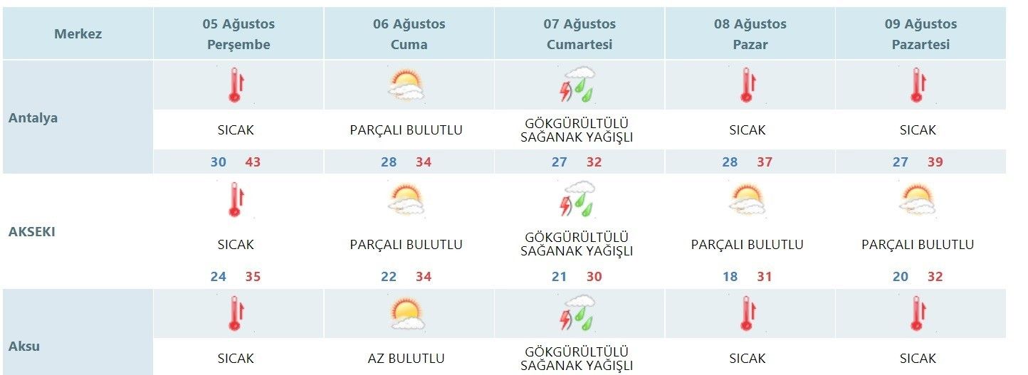 Meteoroloji 4. Bölge Müdürlüğü ise Antalya'da Cumartesi günü gök gürültülü sağanak yağmur beklendiğinin müjdesini paylaştı. Yapılan tahminde Antalya'da hava sıcaklıkları Cuma günü 10 dereceye yakın düşecek. Bugün hava sıcaklık değerleri 43 dereceye kadar çıkarken yağmur beklenen Cumartesi günü 32 dereceye kadar inecek.