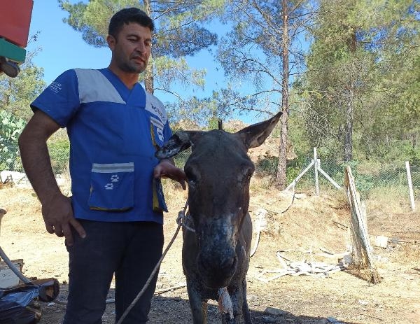 Marmaris'teki orman yangınında, 1'inci ve 2'nci derece yanıklarının oluştuğu belirlenen eşek, tedaviye alındı.