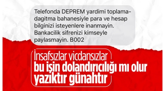 "Telefonda deprem yardımı toplama-dağıtma bahanesiyle para ve hesap bilgilerinizi isteyenlere inanmayın. Bankacılık şifrenizi kimseyle paylaşmayın."